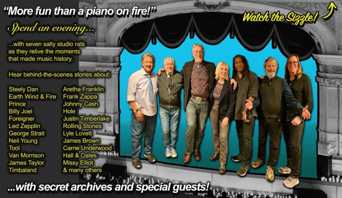 Studio Confidential is an intimate on-stage event where seven of music's most accomplished producers and engineers share behind-the-scenes stories from iconic recording sessions, personal career highlights and riveting rockstar-studded moments. The show balances reverence for craft with moments of pure comedy. There are many unpredictable, laugh out loud and gripping moments that make Studio Confidential such a singular celebration of music and the visionaries who make it come to life.
